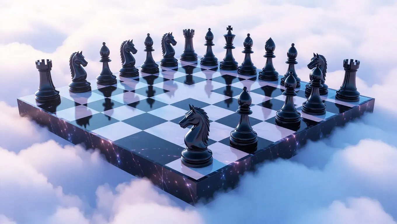 A colossal, shimmering chessboard floats serenely above the clouds, its black and white squares crafted from glimmering twilight. Each square glows softly, edges lined with delicate nebulae. Massive, living chess pieces—knights as fierce wolves, bishops as silver foxes—move gracefully, casting long shadows on the cloud-sea below.