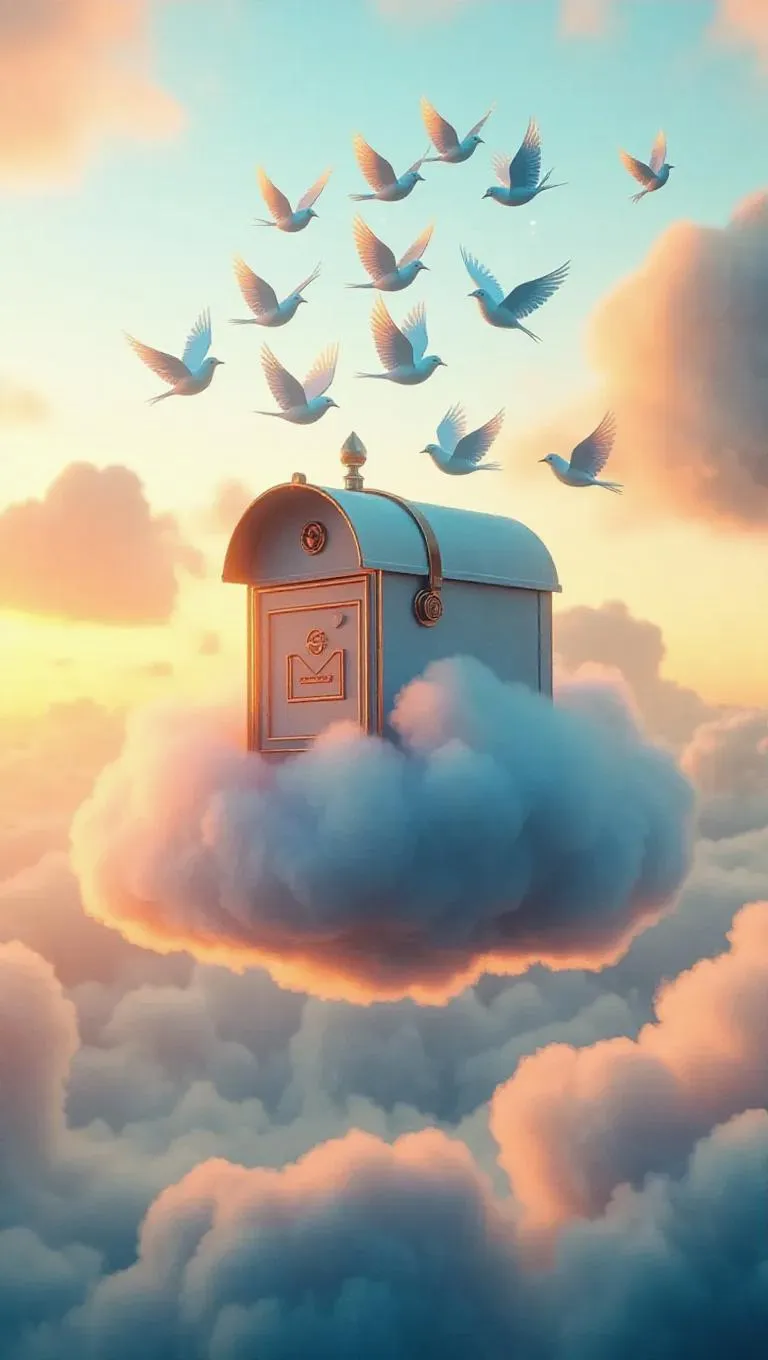 A whimsical mailbox perched atop a fluffy cloud, with delicate paper birds fluttering out, creating a magical dawn sky filled with warm colors and soft, ethereal light.