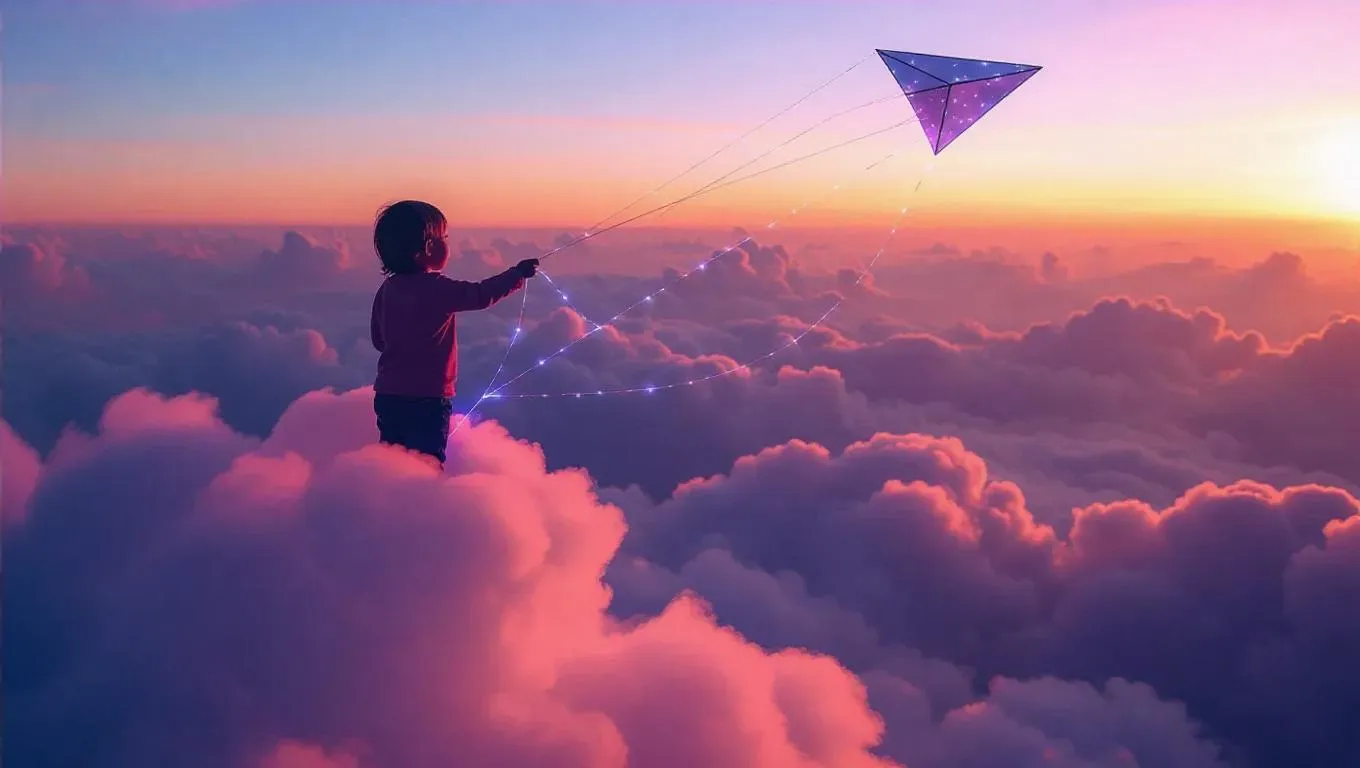 A child perched on a cloud ledge, flying a kite made of shimmering stars, the celestial strings glistening in the twilight sky, surrounded by fluffy clouds and a horizon painted with hues of pink and purple.