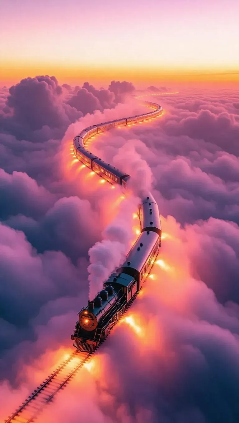 A spectral train made of swirling mist, gliding effortlessly along ethereal tracks laid across fluffy white clouds, bathed in a soft, warm glow, with flares of fire trailing behind, creating a dreamlike and enchanting atmosphere.