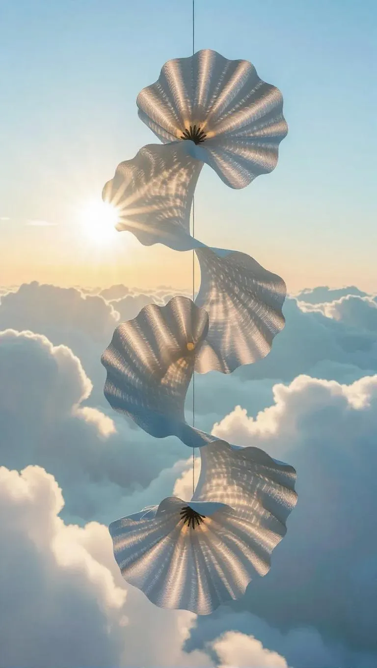 The sculptures are shaped from a pliable textile that can dangle above the clouds. They are inspired by celestial bodies, vibrant flowers, or minimalist shapes. These sculptures convey a message of peace and freedom, creating a calming and serene ambiance. The morning light floods through them, casting tranquil images on the clouds below.
