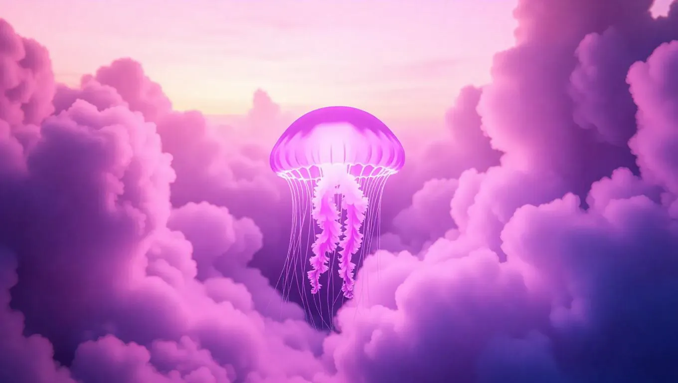 A luminescent jellyfish swimming through cotton candy clouds, soft pink sky glowing with a dreamy, otherworldly aura, creating a serene and mystical atmosphere