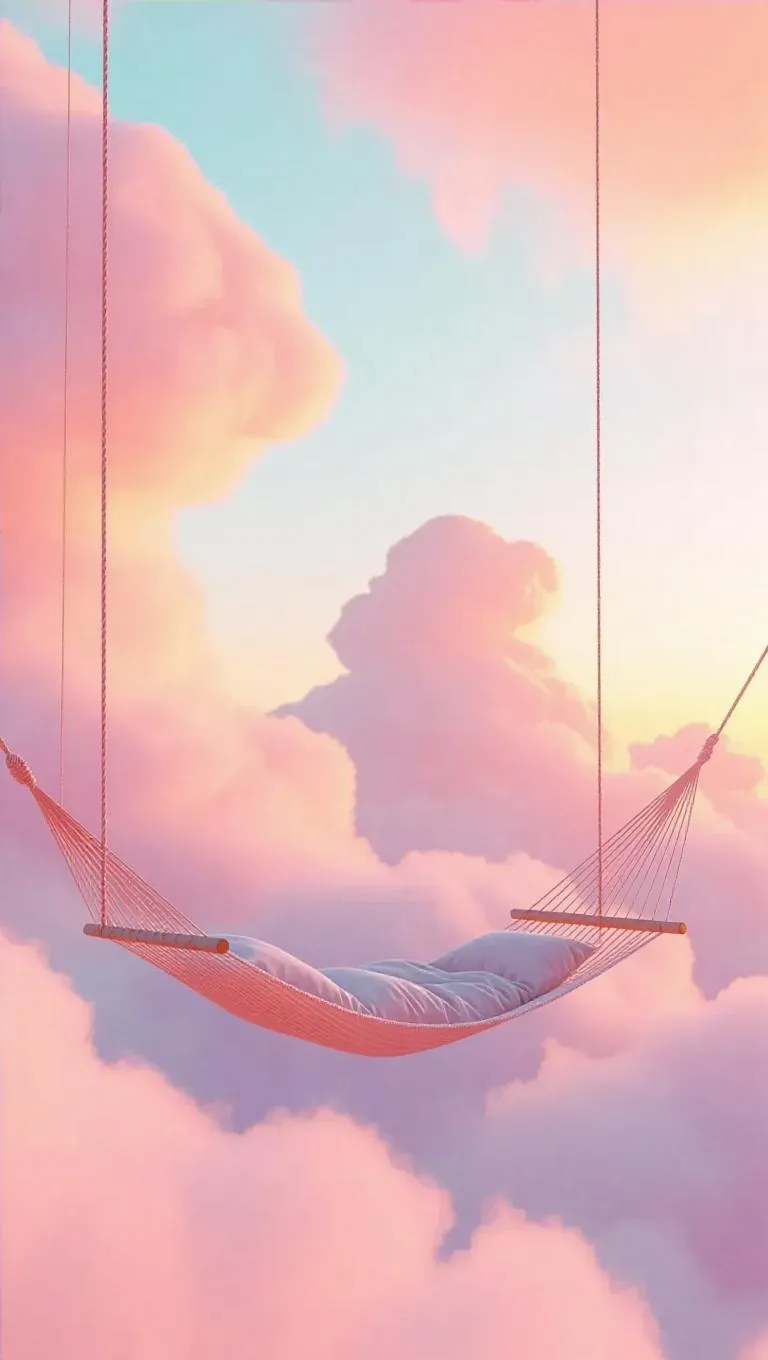 Suspended between two wispy cloud pillars, these hammocks woven from soft, breathable flame-colored cloud-fibers sway gently with the breeze. Lying in them, you can bask in the serene rocking motion, gazing up at the expansive pastel sky and fluffy clouds, enveloped in a tranquil, stress-free atmosphere.