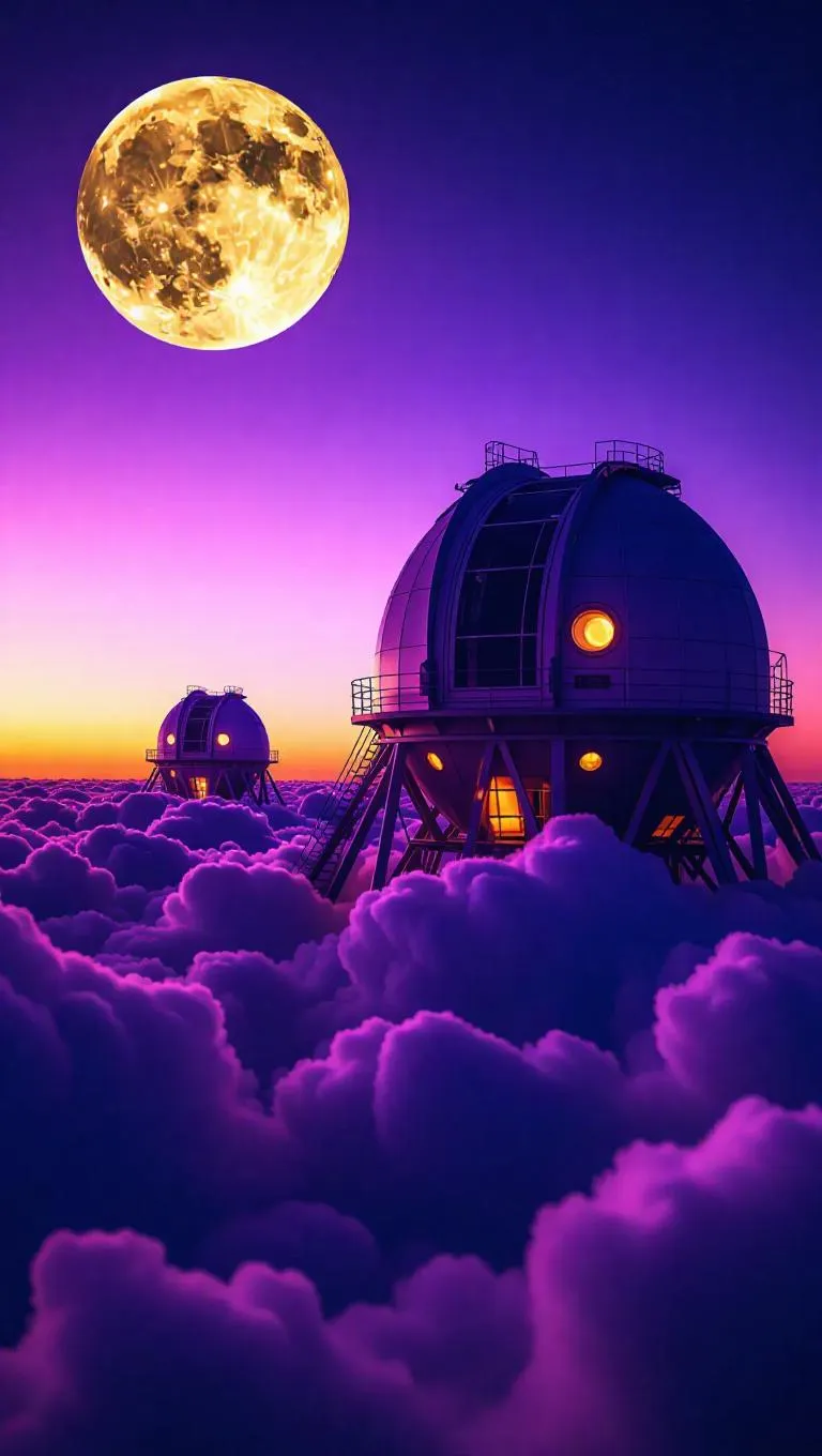 Guests meet on sweeping, flat cloud surfaces adorned with advanced telescopes and cozy rest areas. Expert astronomers share engrossing tales and trivia about the nocturnal skies, while others indulge in snacks of candy clouds and moonlit fruit punch beneath the glowing presence of a full moon.