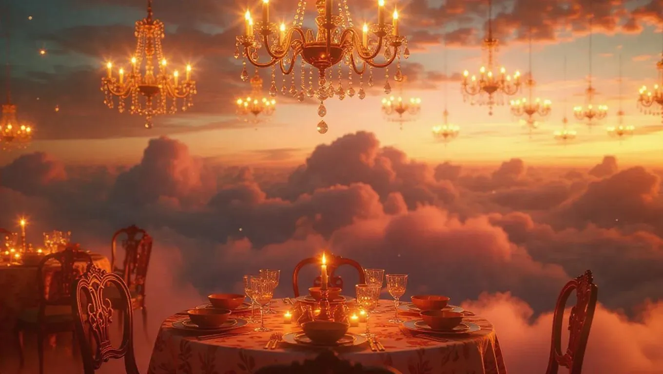 Above the clouds, a mystical storytelling event occurs on a magical cloud platform. Stardust chandeliers cast a warm glow, illuminating eager listeners. Tables are adorned with tale-themed tablecloths, holding enchanting goblets and decorative dishes, sparking imagination.