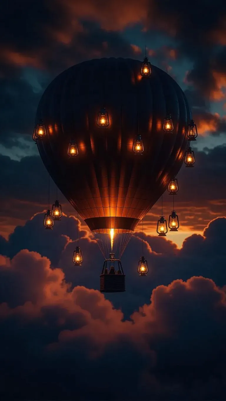 A bold hot air balloon tethered to a dark velvet cloud, surrounded by glowing lanterns that cast a deep, mysterious light, creating a magical atmosphere in a sky painted with midnight colors.