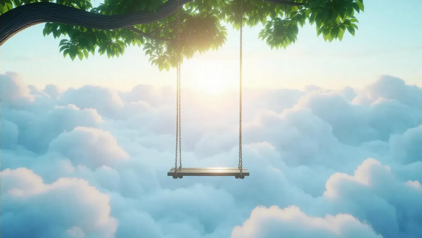 A tranquil swing hanging from a solitary tree, suspended above fluffy white clouds, capturing a serene and peaceful mood, with soft sunlight filtering through, casting gentle shadows and enhancing the ethereal atmosphere