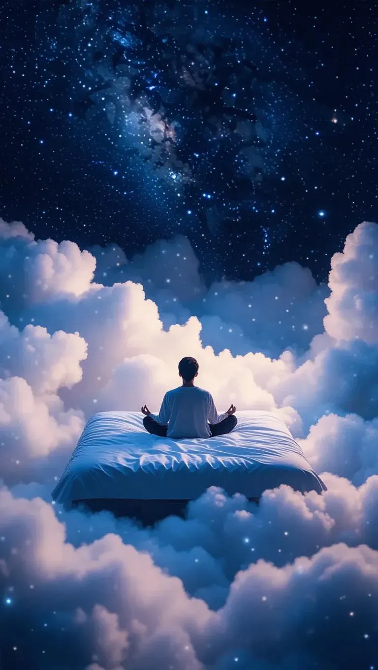 A bed made of clouds, with a person peacefully meditating, floating among constellations