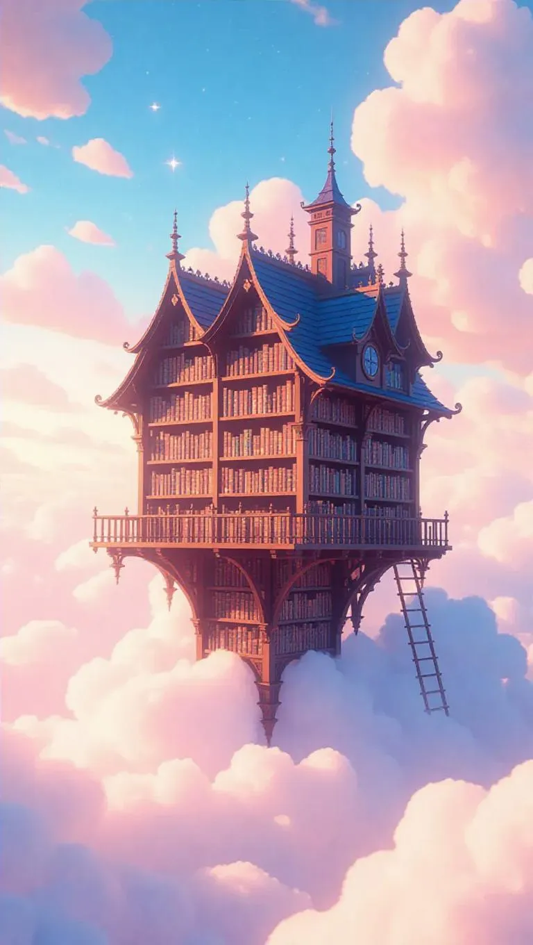 A whimsical library lofted among clouds, ancient narratives floating whimsically and glowing tenderly, ethereal light painting abstract shadows, enveloped by fluffy mist and pastel stars.