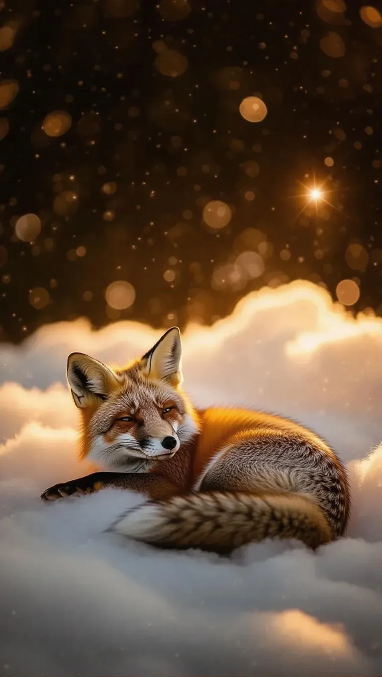 A fox curled up on a soft cloud, illuminated by the gentle, golden glow of a sunset, surrounded by blinking stars and light wisps of haze, creating a calm and ethereal atmosphere.