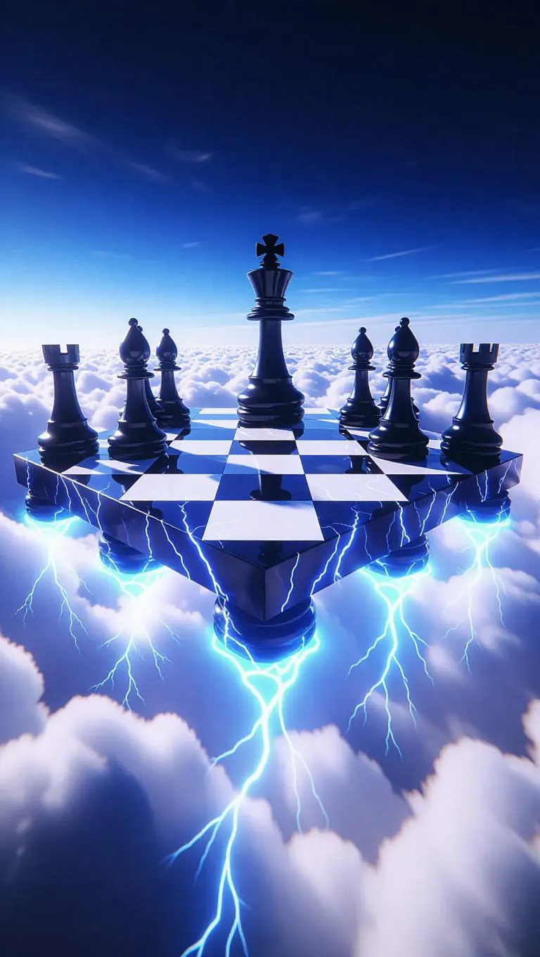 A colossal, shimmering chessboard floats serenely above the clouds, its black and white squares crafted from electric energy. Each square glows softly, edges lined with vibrant arcs of lightning. Massive, living chess pieces—knights as ethereal beings, bishops as time travelers—move gracefully, casting long shadows on the cloud-sea below.