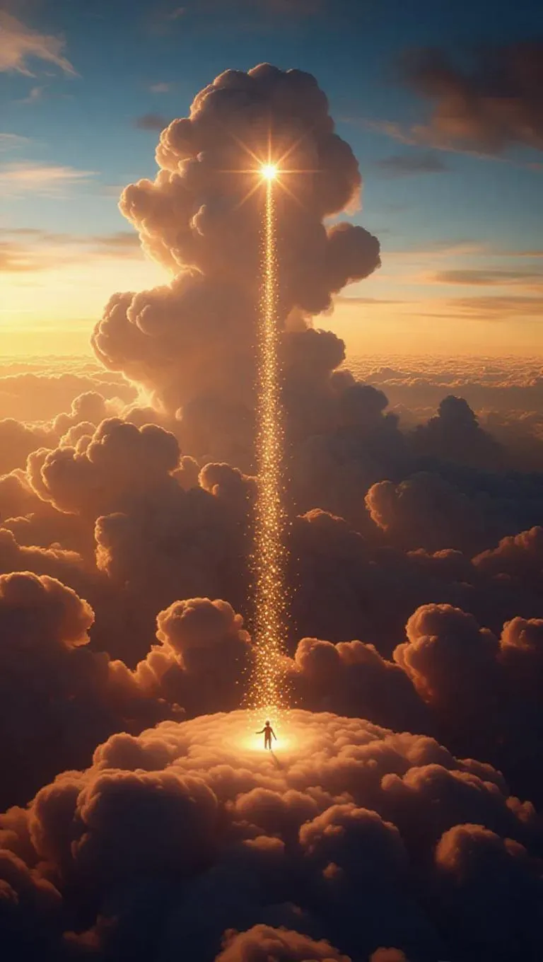 16. Towering cloud slides tumble down from the golden sunrise sky, their surfaces dusted with heavenly brilliance. Children slide down at breathtaking speed, leaving behind long, luminous trails of shining stars that arc gracefully through the air. At the base, a soft, fluffy cloud trampoline awaits, and every joyful jump sends countless sparkling specks flying into the euphoric atmosphere.