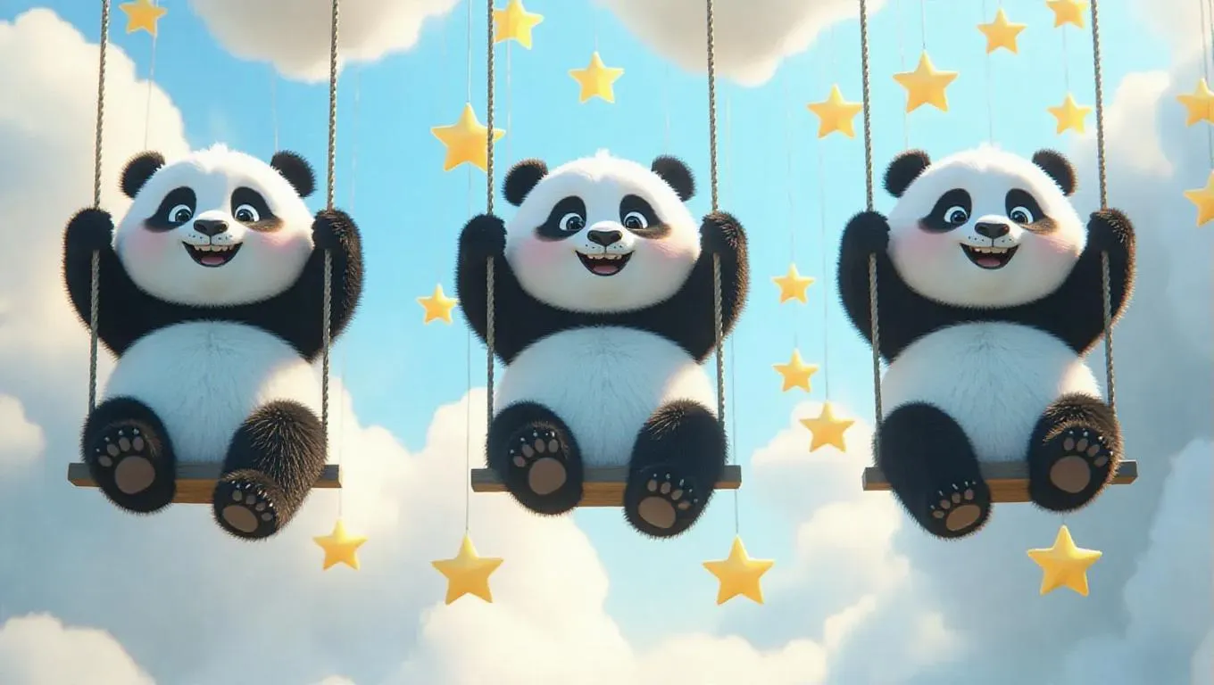 Fluffy, black-and-white cloud pandas swing joyfully beneath hovering star-shaped cloud pillars. Button noses twitch playfully, sleepy eyes crinkle with delight as they grip glowing feather-shaped ropes. Puffy paws dangle freely, clouds billow softly beneath them. Tiny cloud fairies hitch rides, giggling as they soar through the vibrant sky, carried by the gentle breeze and the rhythmic sway of the panda swings.