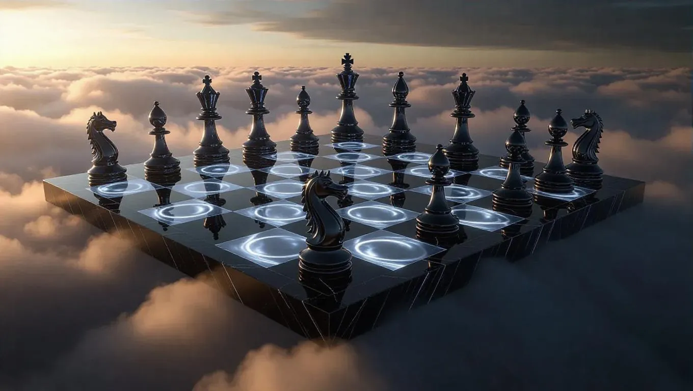 A colossal, shimmering chessboard floats serenely above the clouds, its black and white squares crafted from luminous pearls. Each square glows softly, edges lined with swirling cosmic patterns. Massive, living chess pieces—knights as powerful dragons, bishops as graceful swans—move gracefully, casting long shadows on the cloud-sea below.