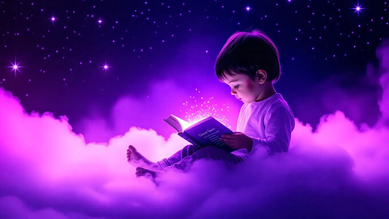 A child sitting on a fluffy cloud, deeply involved in a glowing book, highlighted by soft, violet lighting, surrounded by bright stars and gentle mist, creating a magical and serene atmosphere