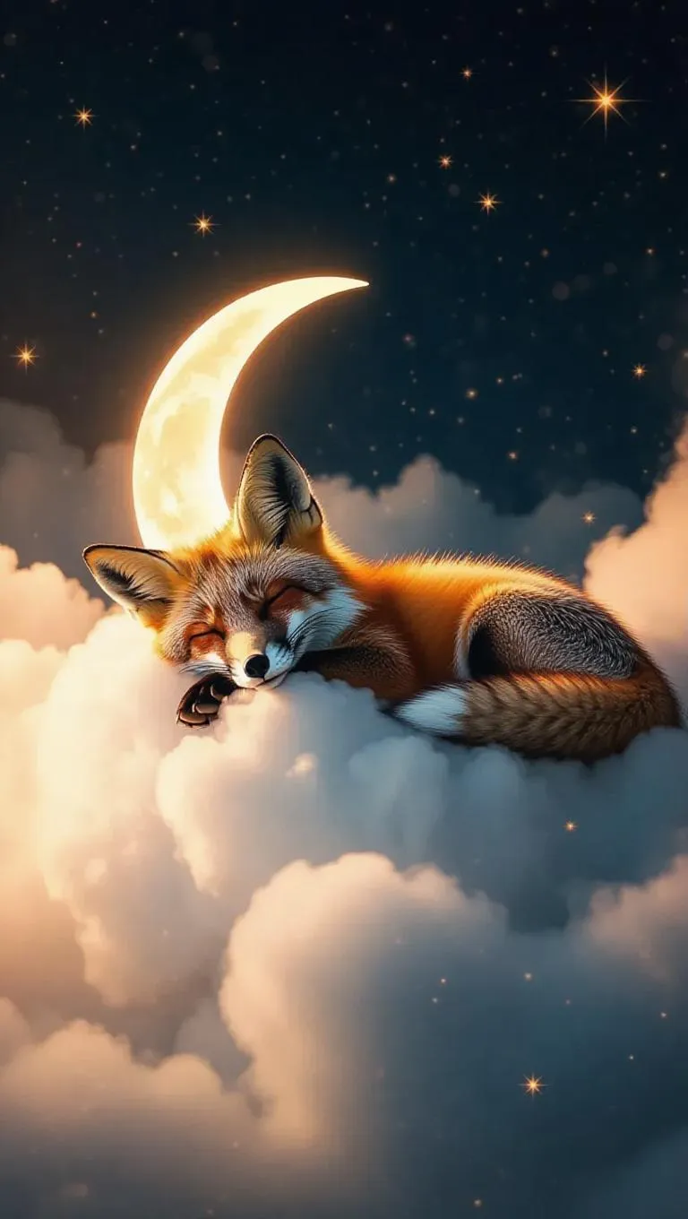 A fox dozing on a cloud, illuminated by the ethereal glow of a crescent moon, surrounded by sparkling stars and floating threads of mist, creating a mystical and calming atmosphere.