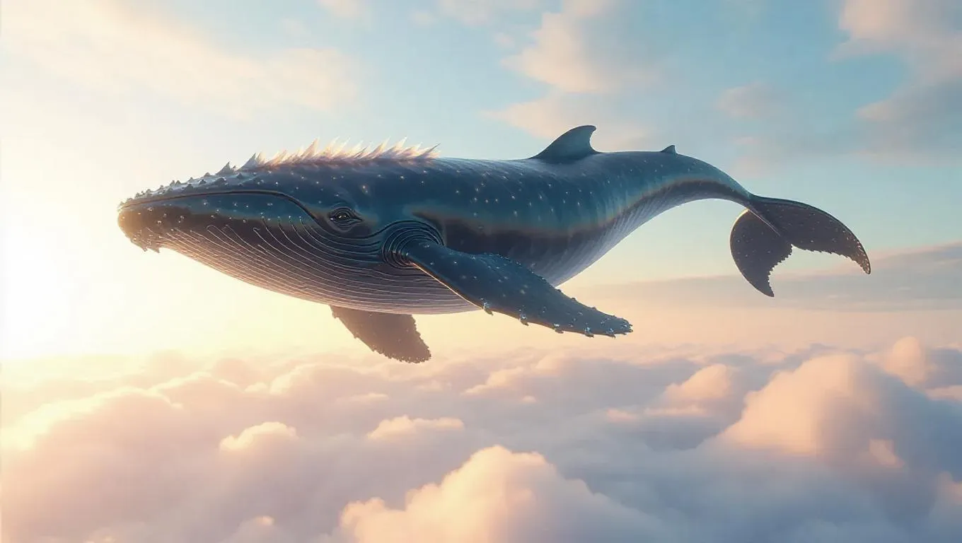 A colossal whale flying through the morning sky, gliding gently over soft clouds, with glimmering feathers entwined around its body, casting a mystical glow, creating a surreal and enchanting scene