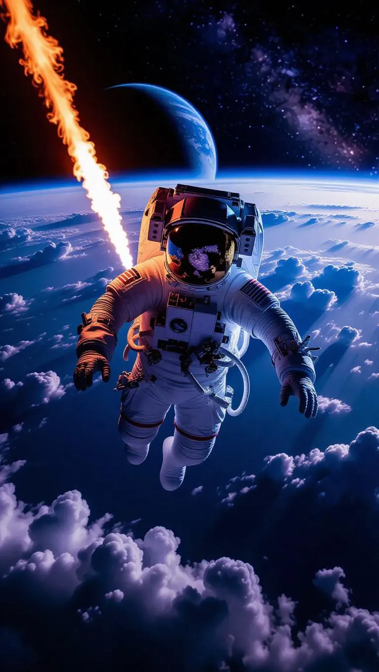 At 8,000 meters above the ground, astronauts float leisurely through the firmament, embarking on a cosmic odyssey. They glide among luminous clouds, their spacesuits glinting in the vibrant sunlight. Some hold onto shooting flames like reins, guiding themselves skillfully through the starlit expanse. They pass by shimmering cloud castles, peek into caverns filled with stardust, and see streams of liquid light flowing gracefully between floating islands. Sparkling diamond-like clouds, morphing constellations, and enchanting sky wonders envelop them, creating an unforgettable adventure through the heavens.