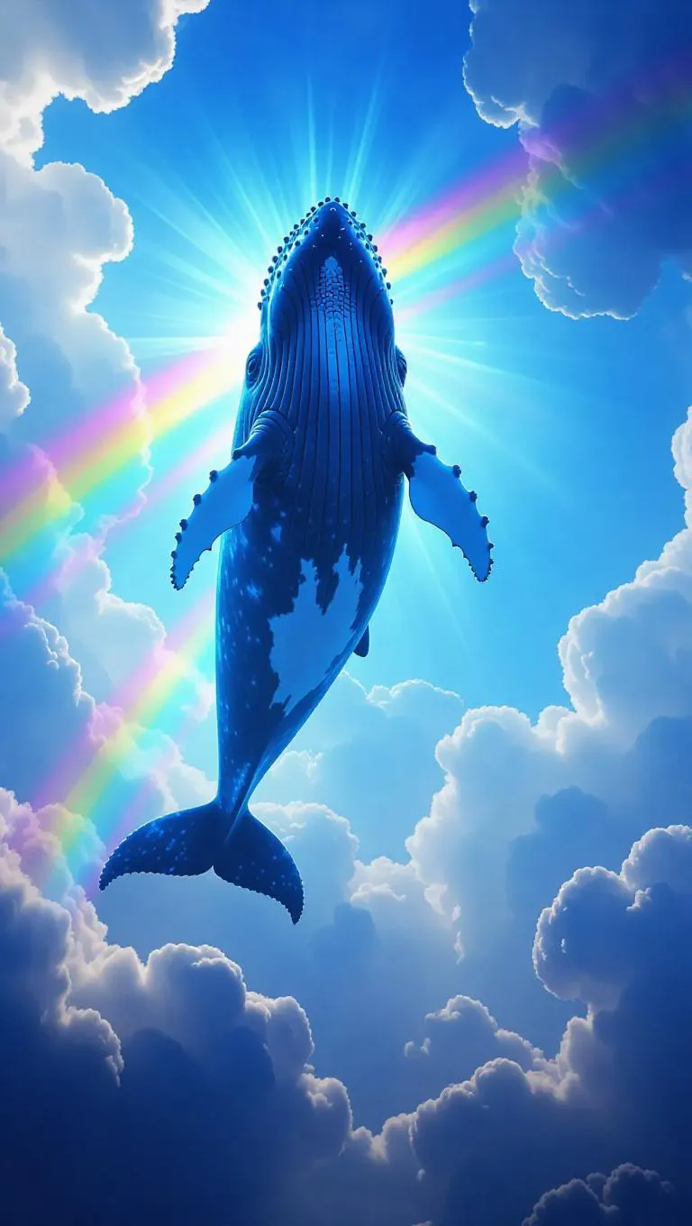 A gigantic whale soaring through a bright blue sky, gliding over fluffy white clouds, with radiant rainbows entwined around its body, casting a mystical glow, creating a surreal and enchanting scene