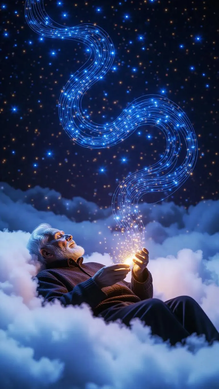 An elderly storyteller lays on a puffy cloud, weaving tales with shimmering threads of starlight that twist into crystalline, sharp shapes above their hands. Below, the world sleeps under a quilt of thick fog, while fireflies blink like distant stars, ready to come alive.