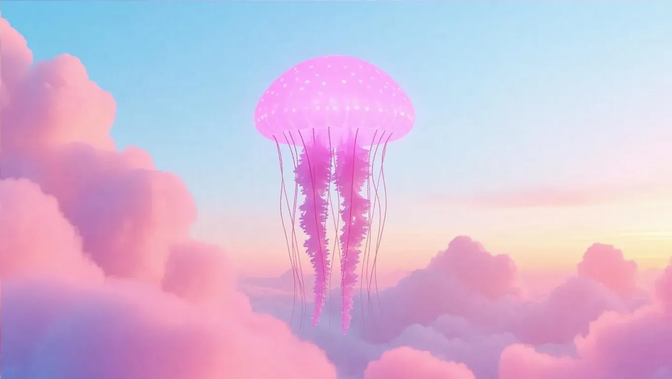 A luminescent jellyfish floating gently over tranquil clouds, soft pink sky glowing with a dreamy, otherworldly aura, creating a serene and mystical atmosphere