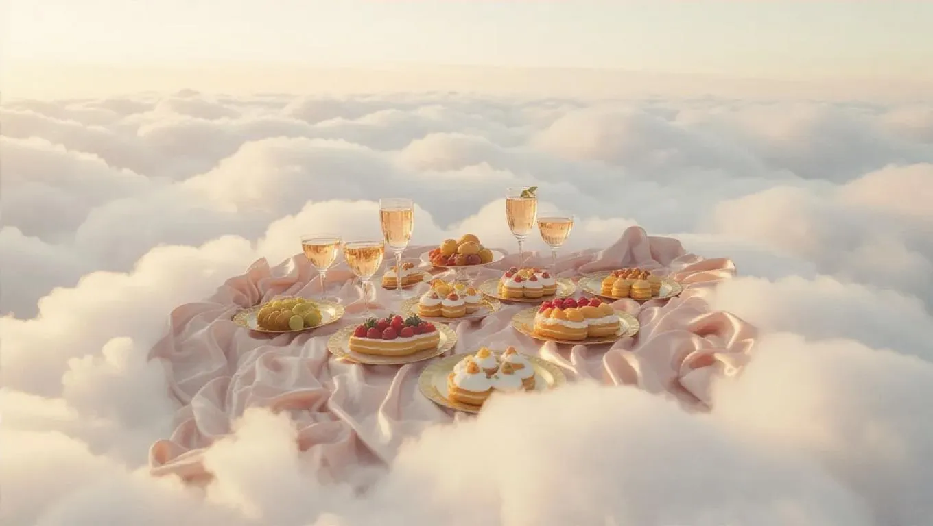 Above the clouds, an enchanting soirée unfolds on a vast, cushioned expanse of soft, fluffy clouds. A silk blanket, shimmering with tiny star-like sparkles, is spread out, adorned with an array of luxurious treats. Gold plates hold éclairs made with filling as soft as clouds, filled with slices of exotic fruits that seem to capture the essence of the sun, surrounded by delicate pastries and sparkling beverages.
