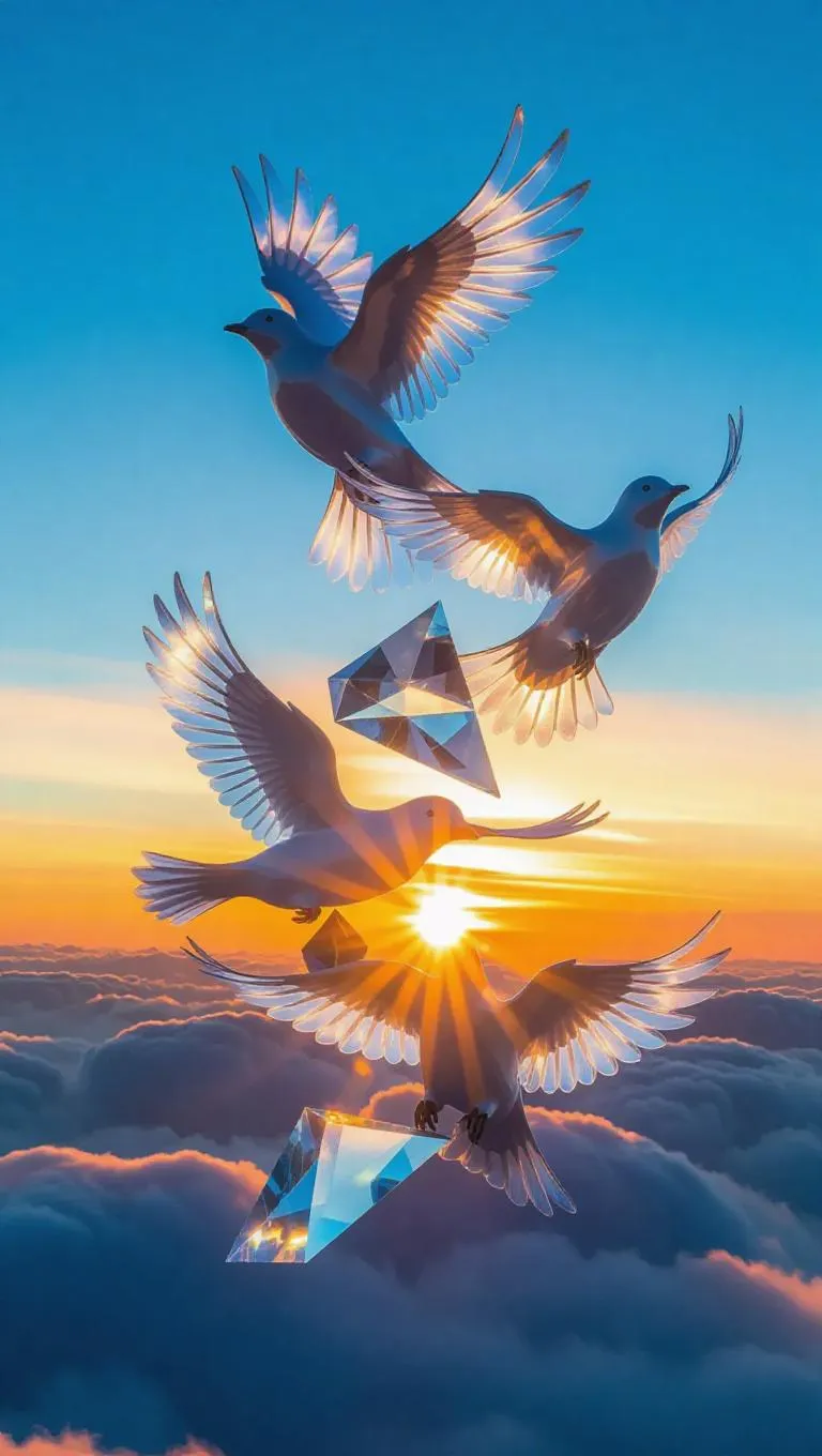 The sculptures are created using a translucent medium that can hover delicately above the clouds. They take the shapes of abstract illustrations, birds, or geometric shapes. These sculptures emit a sense of wonder as they float, creating a captivating and imaginative scene. The vibrant sunset rays shine through them, casting intricate designs on the clouds below.