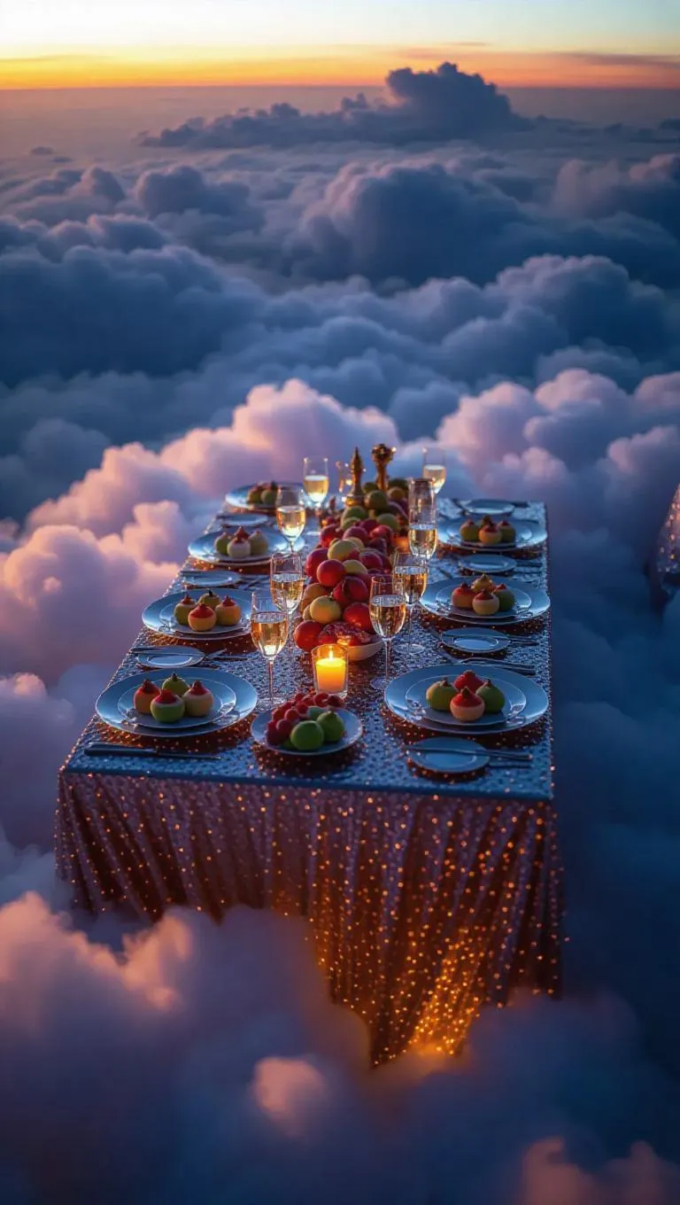Above the clouds, a romantic dinner unfolds on a vast, cushioned expanse of soft, fluffy clouds. A silken table cover, shimmering with tiny star-like sparkles, is spread out, adorned with an array of delectable treats. Glass plates hold foams made with ingredients as light as clouds, filled with slices of luscious fruits that seem to capture the essence of the sun, surrounded by exquisite pastries and sparkling beverages.