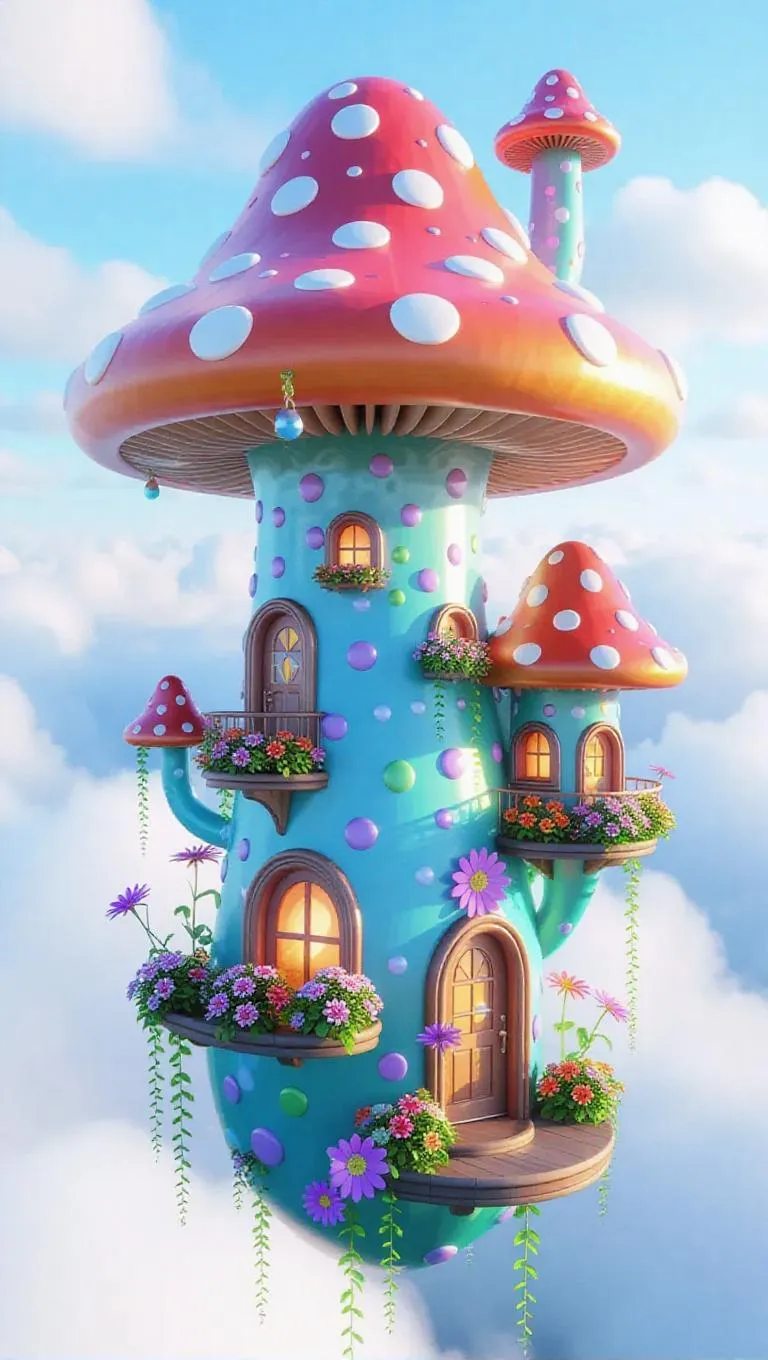 Tiny mushroom-shaped apartments crafted from a blend of cloud and rainbow essence, floating dreamily above the pillowy clouds. Exotic caps with polka dots and swirls, thick curved stems. Tiny doors and windows with flowing fabrics, flower boxes spilling over with bright blooms, enhancing the magical ambiance.