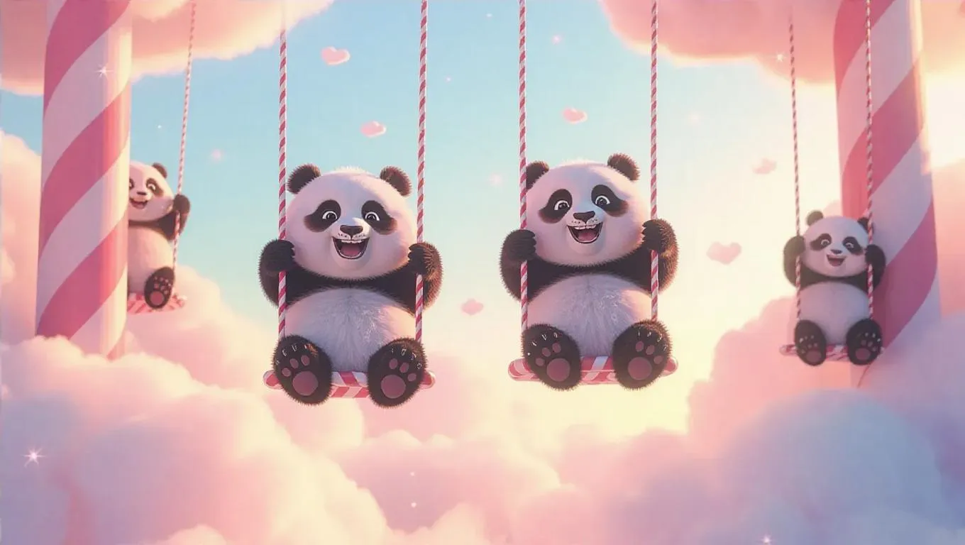 Fluffy, lavender cloud pandas swing joyfully between serene cloud pillars. Button noses twitch playfully, sleepy eyes twinkle with joy as they grip glowing candy cane-shaped ropes. Puffy paws dangle freely, clouds billow softly beneath them. Tiny cloud fairies hitch rides, giggling as they soar through the pastel sky, carried by the gentle breeze and the rhythmic sway of the panda swings.