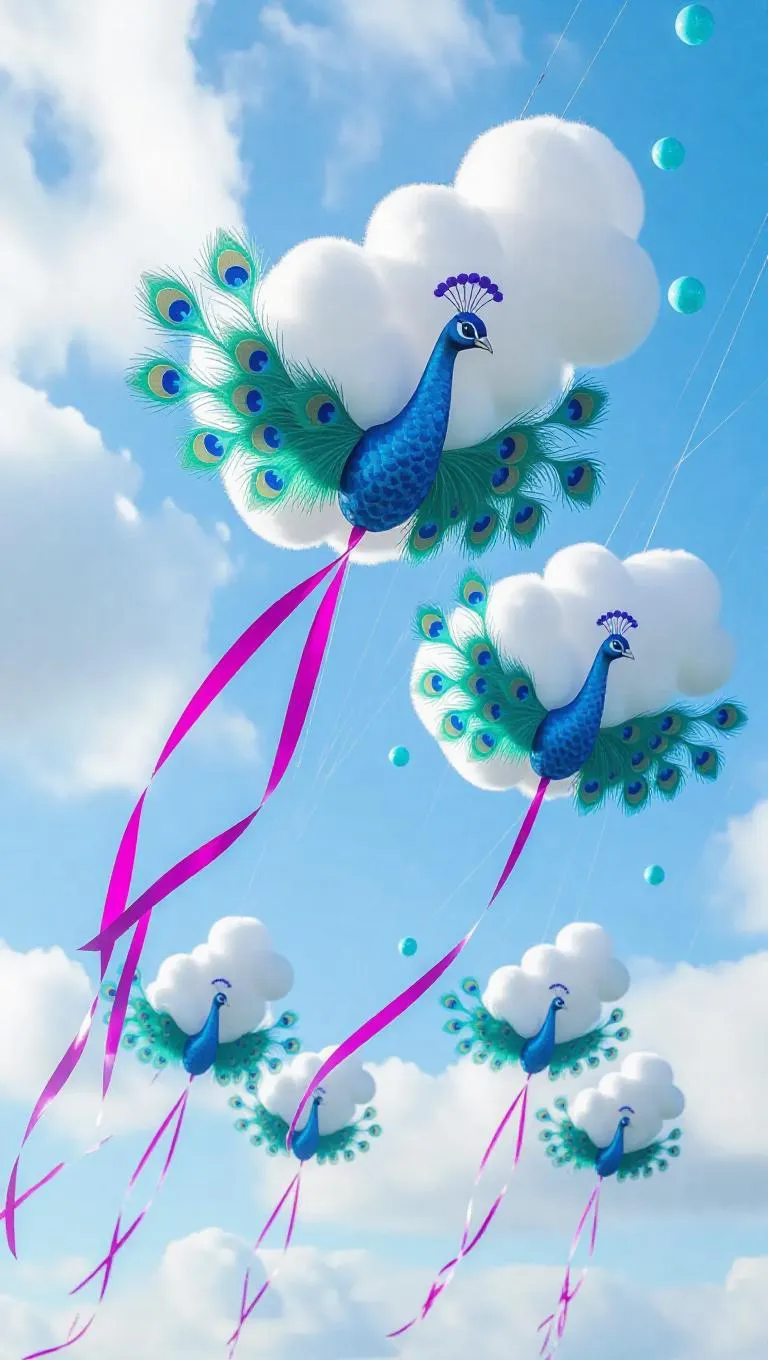 Fuzzy, cloud kites shaped like peacocks with long feathers and fluffy tails flutter in the sky, each adorned with a magenta ribbon trailing in a glittering stream. Cherubic sky sprites sing as they tug on the strings, making the kites perform flutters and chase floating blueberry clouds.