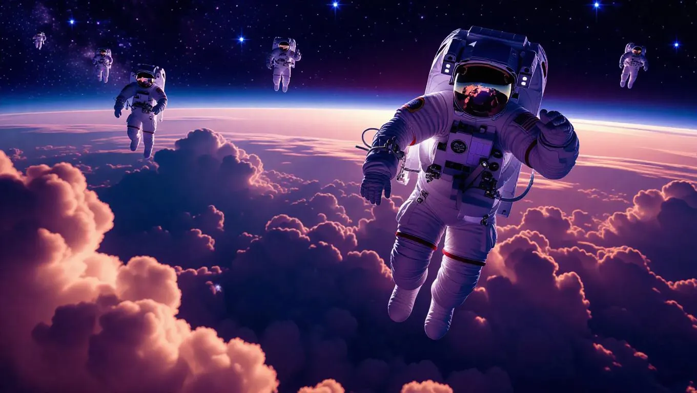 At 8,000 meters above the ground, astronauts float effortlessly through the sky, embarking on a stellar voyage. They glide among vibrant clouds, their reflective gear sparkling in the bright sunlight. Some hold onto shooting flames like reins, maneuvering through the vastness of space. They pass by luminous cloud kingdoms, peek into stardust-filled trenches, and view cascades of liquid light flowing between hovering islands. Shimmering gem-like clouds, migrating constellations, and captivating sky phenomena envelop them, creating a magical journey among the stars.