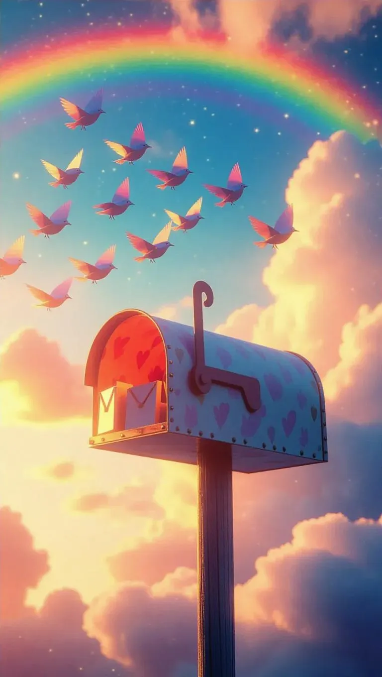 A whimsical mailbox perched under a rainbow, with delicate paper birds fluttering out, creating a magical sky filled with vibrant colors and soft, ethereal light.