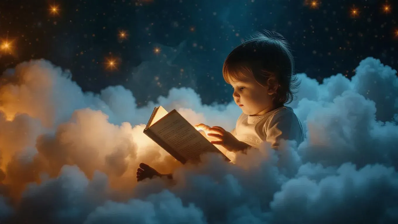 A child nestled on a fluffy cloud, captivated by a glowing book, immersed in soft, silvery lighting, surrounded by shimmering stars and gentle mist, creating a magical and serene atmosphere