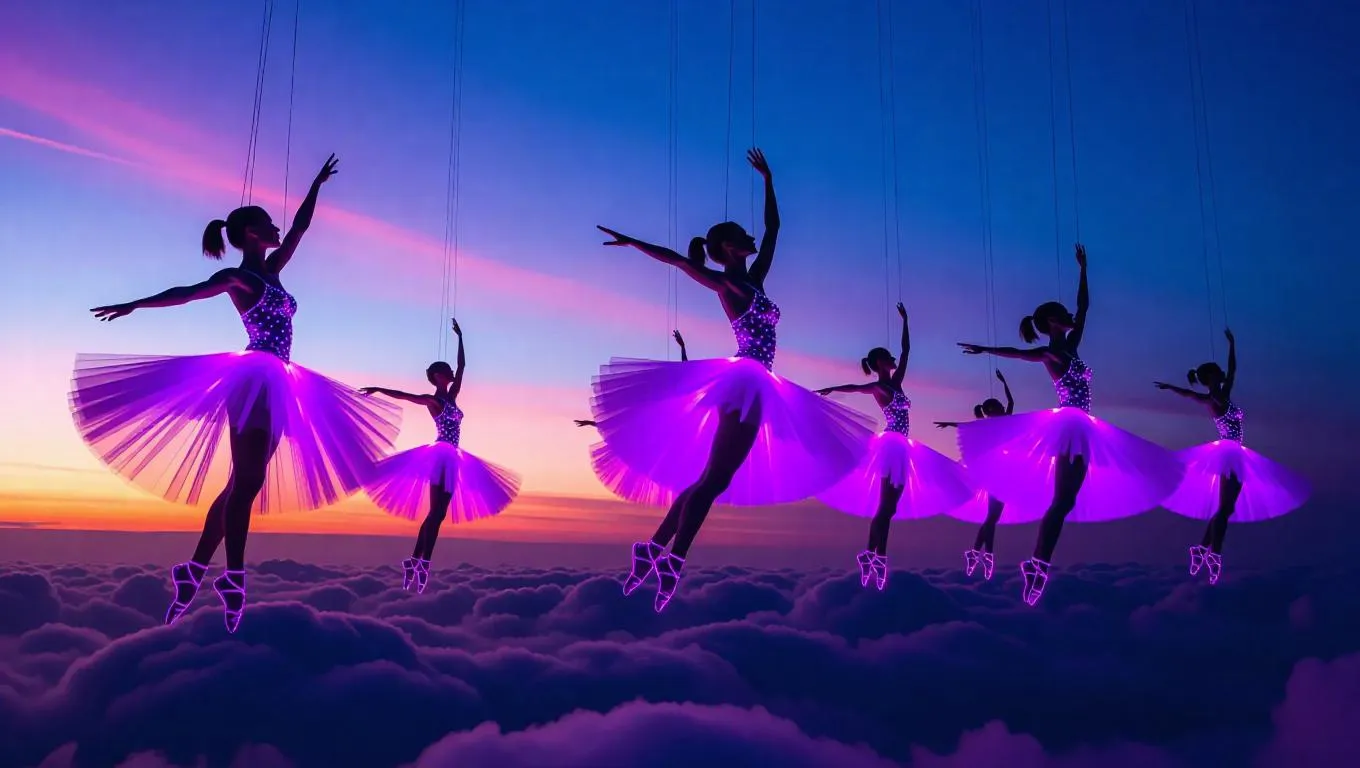 8. Graceful dancers in holographic costumes, suspended by glowing filament harnesses, perform intricate routines amidst serene twilight clouds. They twirl and somersault, guided by gentle updrafts, their movements synchronized to soft, ambient music. The sky serves as a vast, ethereal canvas, enhancing the mesmerizing spectacle.