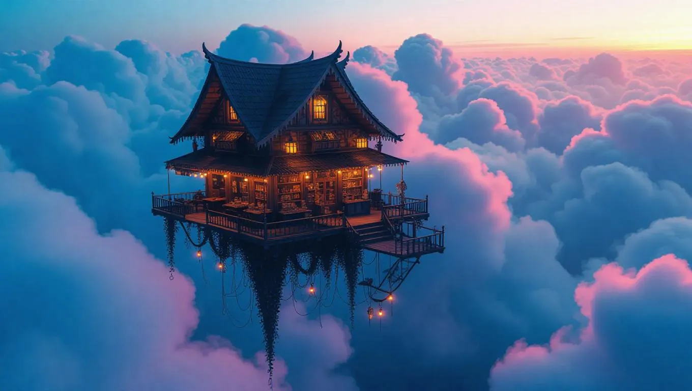 A whimsical floating market atop fluffy clouds, featuring curious, strange stalls adorned with oddities and dreamlike, ethereal lighting that casts a magical glow, creating a surreal and enchanting atmosphere.