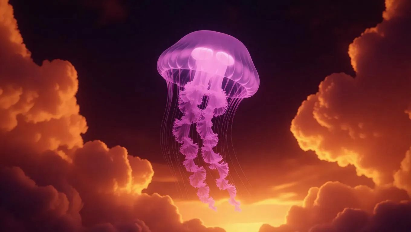 A luminescent jellyfish flowing effortlessly through golden hour clouds, soft pink sky glowing with a dreamy, otherworldly aura, creating a serene and mystical atmosphere