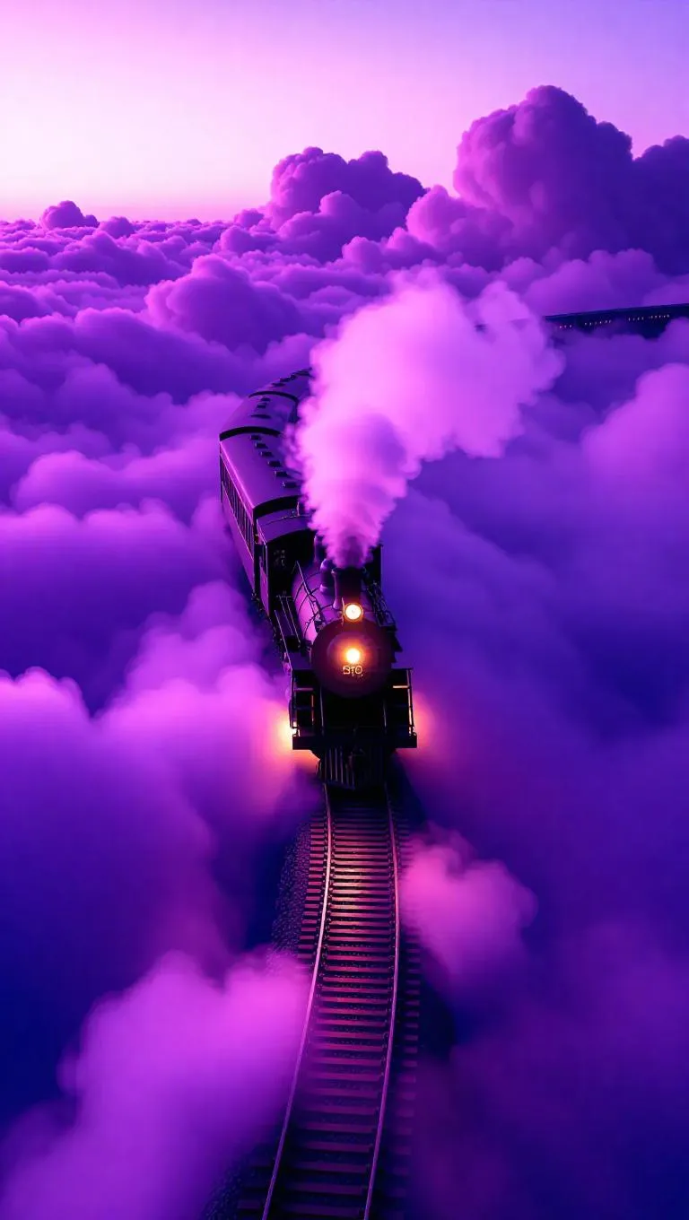 A spectral train made of swirling mist, gliding effortlessly along ethereal tracks laid across lavender-hued clouds, bathed in a soft, tranquil glow, with wisps of fire trailing behind, creating a dreamlike and enchanting atmosphere.