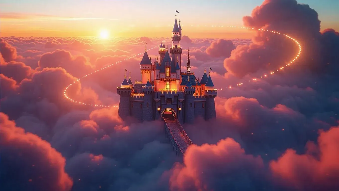 A whimsical fairytale castle floating in the sky, trailing a shimmering trail of sparkles, surrounded by delicate, whimsical clouds and a magical, fairy-tale light.