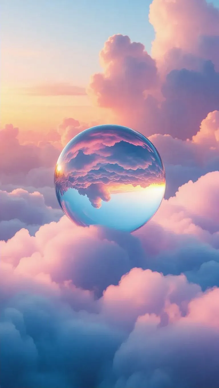 A glistening crystal orb placed on a puffy cloud, mirroring the rich colors of the sky, with soft clouds drifting gently below, creating a dreamlike and magical scene.