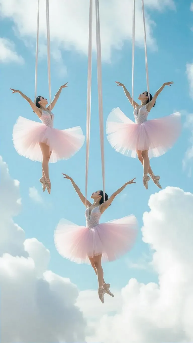 18. Graceful dancers in pastel-colored costumes, suspended by flowing silk harnesses, perform intricate routines amidst soft cotton clouds. They twirl and somersault, guided by gentle updrafts, their movements synchronized to soft, ambient music. The sky serves as a vast, ethereal canvas, enhancing the mesmerizing spectacle.