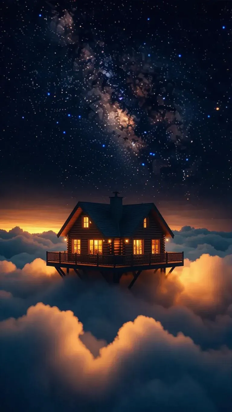 A picturesque lodge floating atop a soft cloud, warm golden light illuminating its windows, shrouded in wispy clouds. Above, radiant star showers fill the night sky, creating a magical and serene atmosphere.