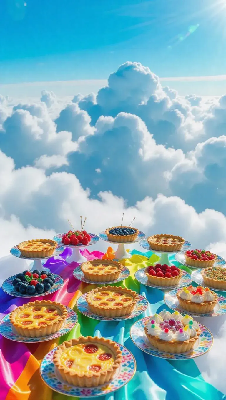 Above the clouds, a delightful gathering unfolds on a vast, cushioned expanse of soft, fluffy clouds. A colorful mat, shimmering with tiny star-like sparkles, is spread out, adorned with an array of yummy treats. Decorative plates hold quiches made with filling as light as clouds, filled with slices of zesty fruits that seem to capture the essence of the sun, surrounded by artisanal pastries and sparkling beverages.