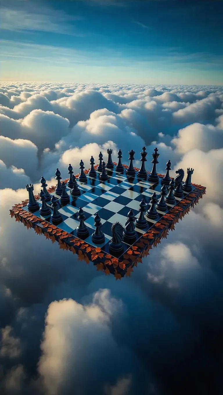 A colossal, shimmering chessboard floats serenely above the clouds, its black and white squares crafted from swirling autumn leaves. Each square glows softly, edges lined with floating petals. Massive, living chess pieces—knights as spirited foxes, bishops as wise ravens—move gracefully, casting long shadows on the cloud-sea below.