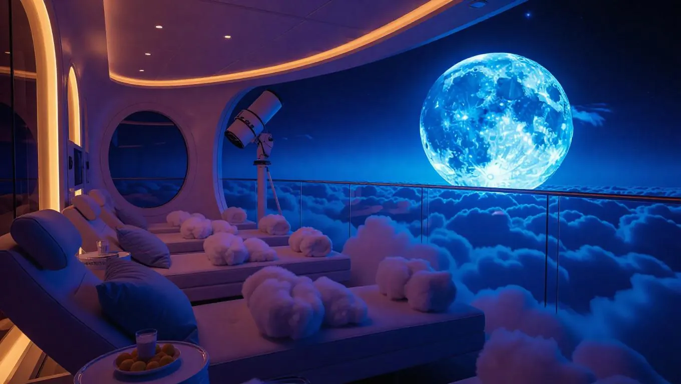 Guests unite on broad, airy cloud decks equipped with modern telescopes and plush recliners. Skilled astronomers convey intriguing stories and insights about the universe, while others munch on fluffy cloud sweets and cosmic citrus drink under the warm glow of a full moon.