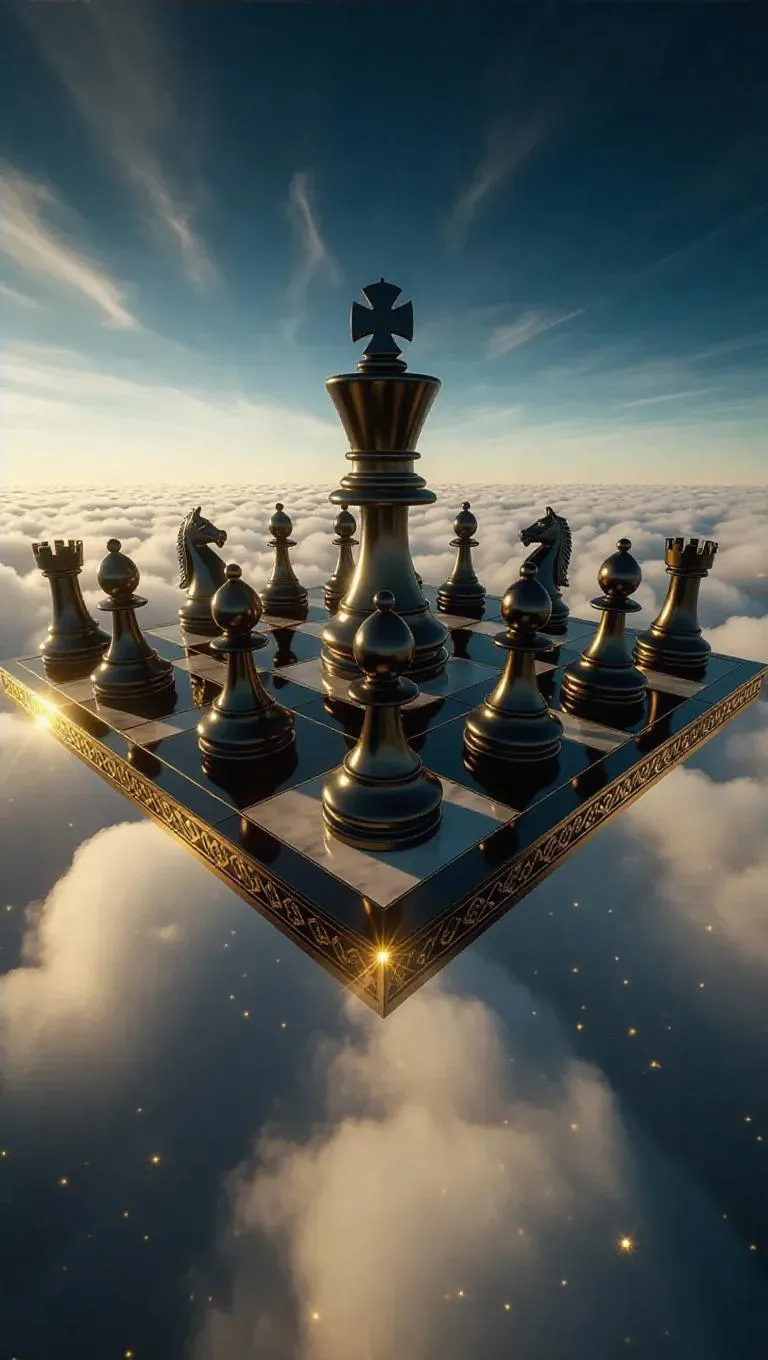 A colossal, shimmering chessboard floats serenely above the clouds, its black and white squares crafted from radiant gold. Each square glows softly, edges lined with flickering gold dust. Massive, living chess pieces—knights as ancient warriors, bishops as wise scholars—move gracefully, casting long shadows on the cloud-sea below.