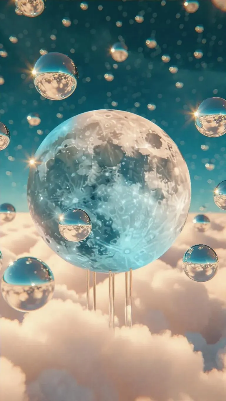 7. Gargantuan moonstone pins stand firmly on a soft cloud expanse, players roll fluffy orbs filled with stellar essence, striking pins that splinter into arcs of silver light, ringing out like a chorus of tiny celestial bells.