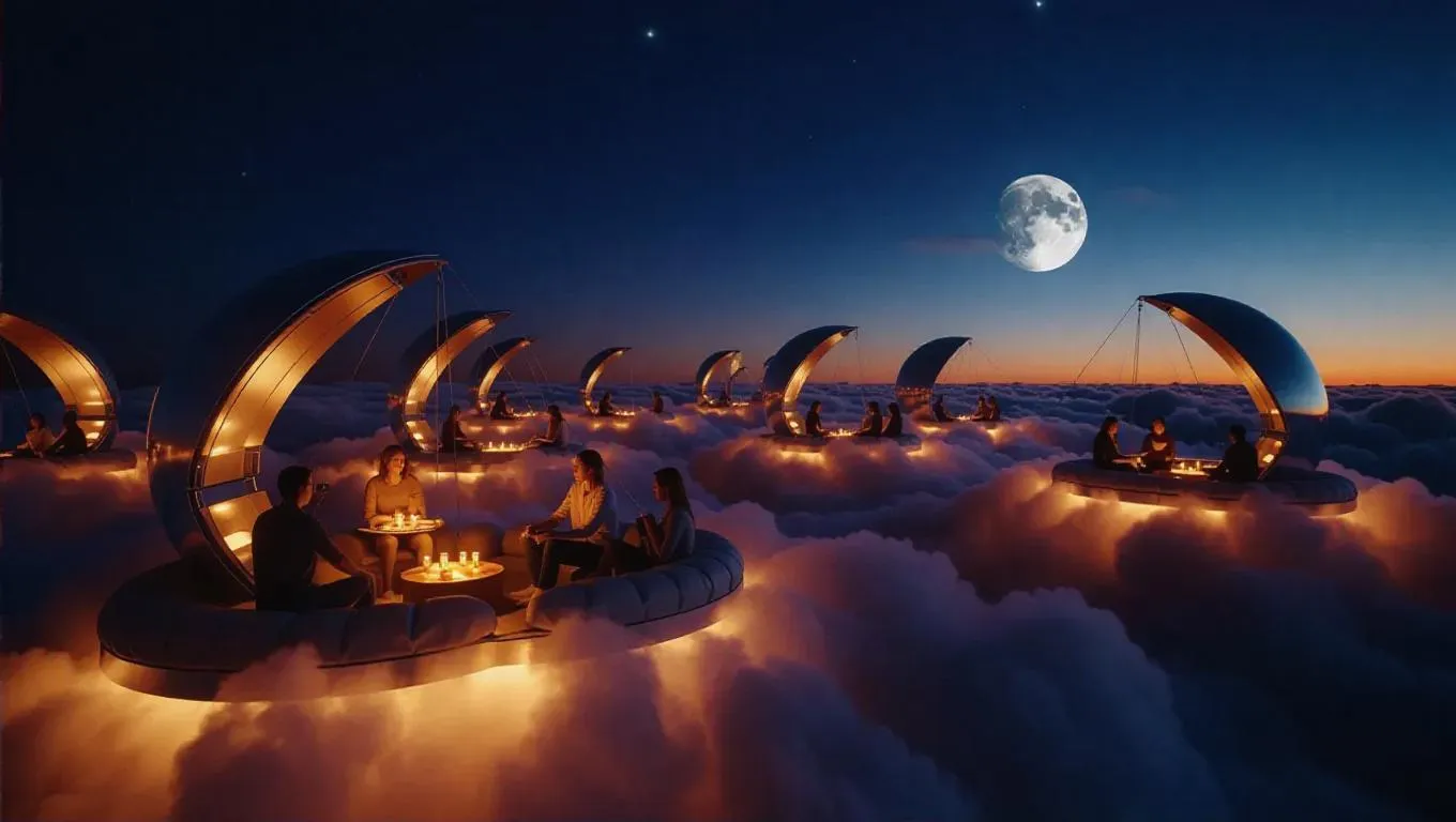 Guests assemble on wide, airy cloud expanses equipped with advanced telescopes and inviting seating spots. Expert astronomers share riveting narratives and information about the night sky, while others indulge in delightful snacks of sugar-spun clouds and cosmic fruit punch beneath the glow of a full moon.