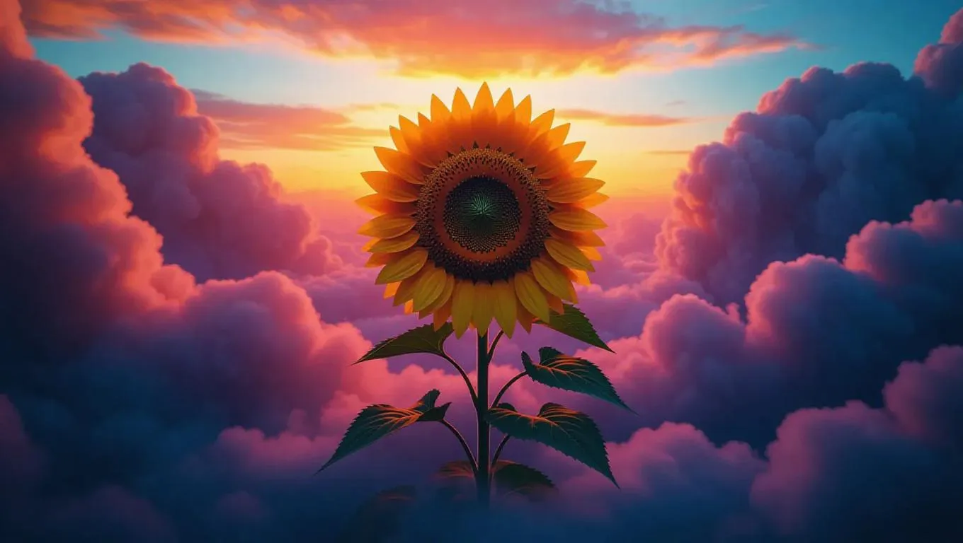 A towering sunflower bursting from a wavy cloud, its dynamic petals reaching for a fiery sun, framed by a sky painted with glowing colors of peach twilight, enhancing a surreal and dreamlike atmosphere.