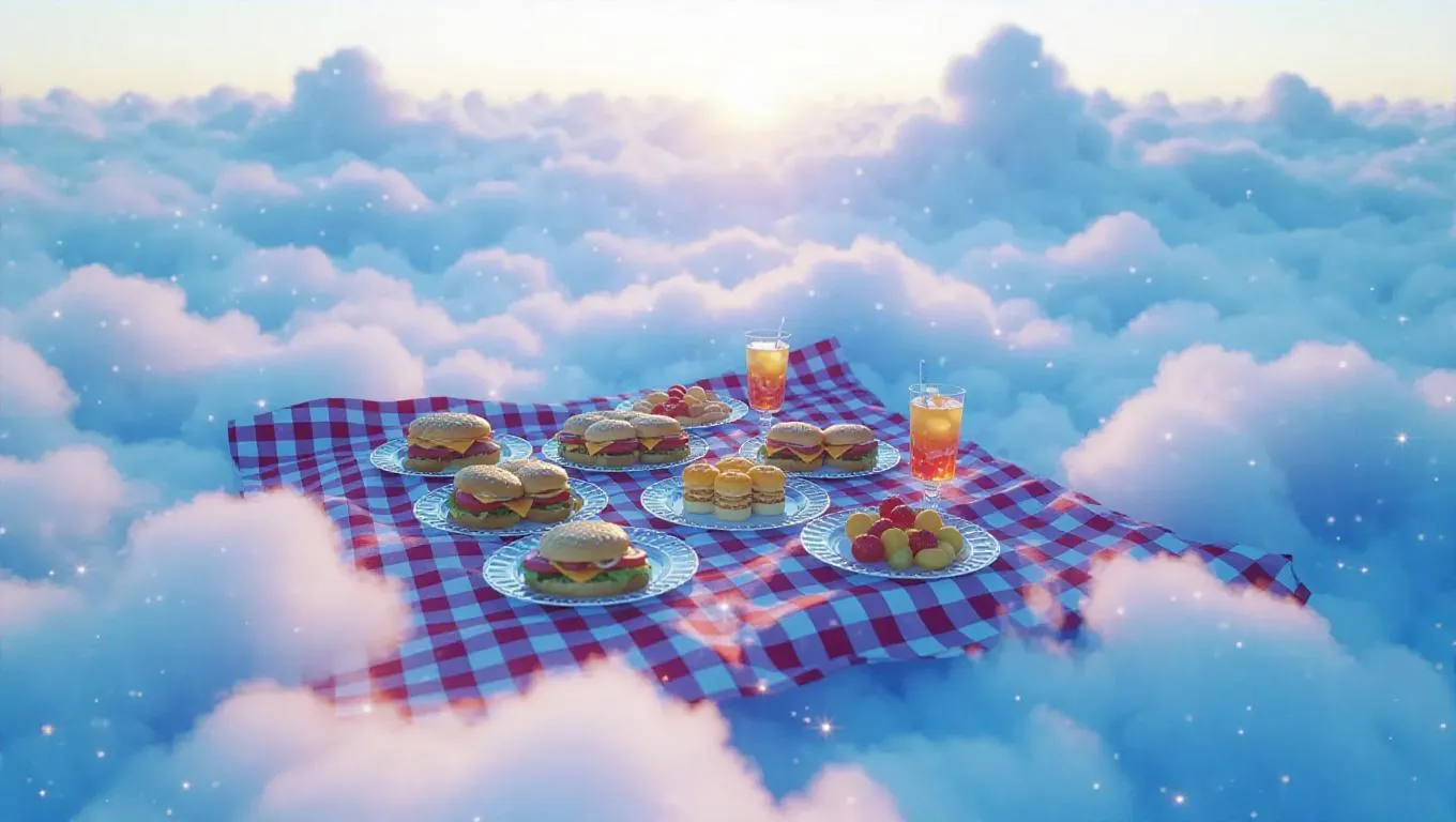 Above the clouds, a whimsical picnic unfolds on a vast, cushioned expanse of soft, fluffy clouds. A gingham blanket, shimmering with tiny star-like sparkles, is spread out, adorned with an array of mouth-watering treats. Crystal plates hold sandwiches made with bread as white as clouds, filled with slices of glowing fruits that seem to capture the essence of the sun, surrounded by delicate pastries and sparkling beverages.